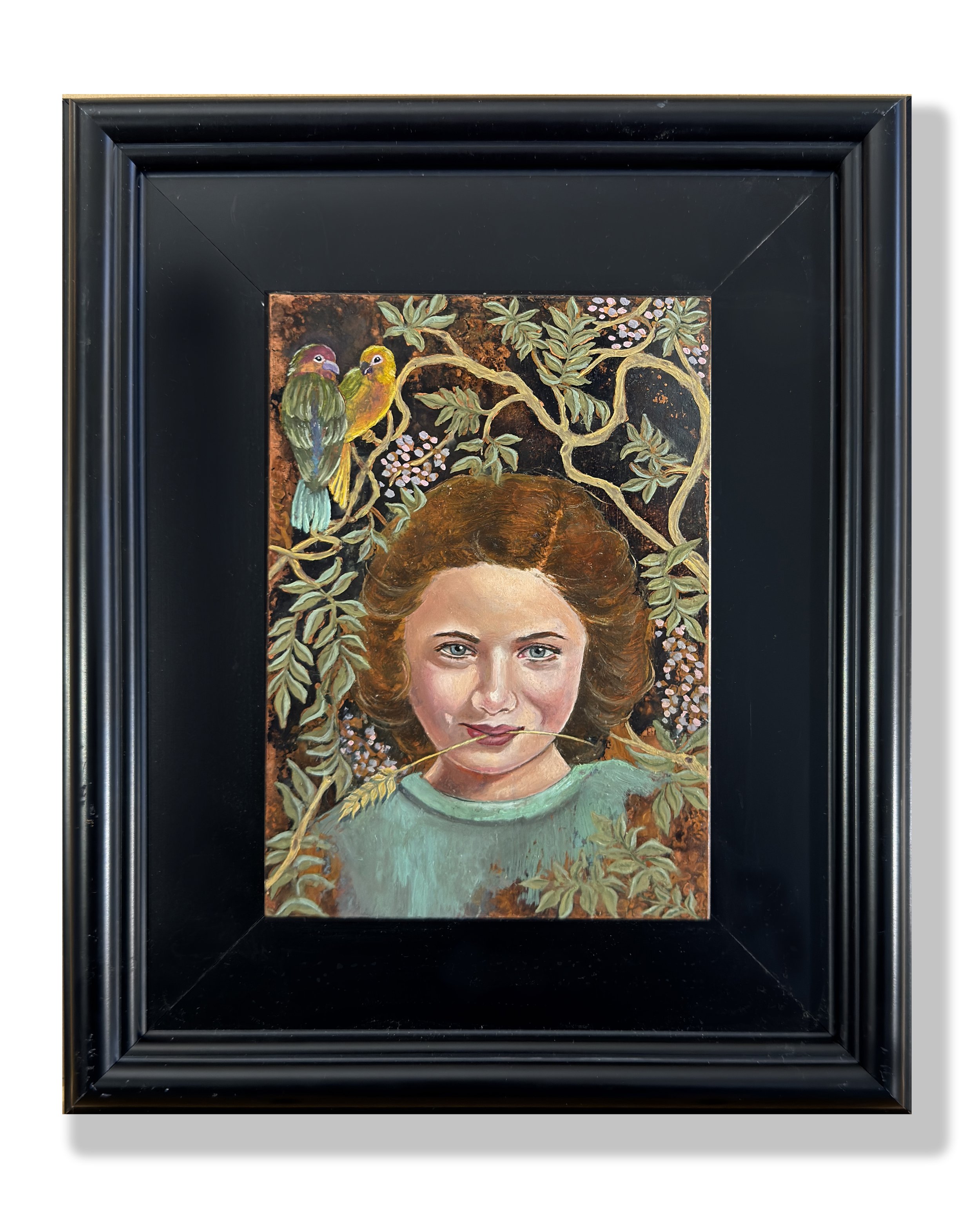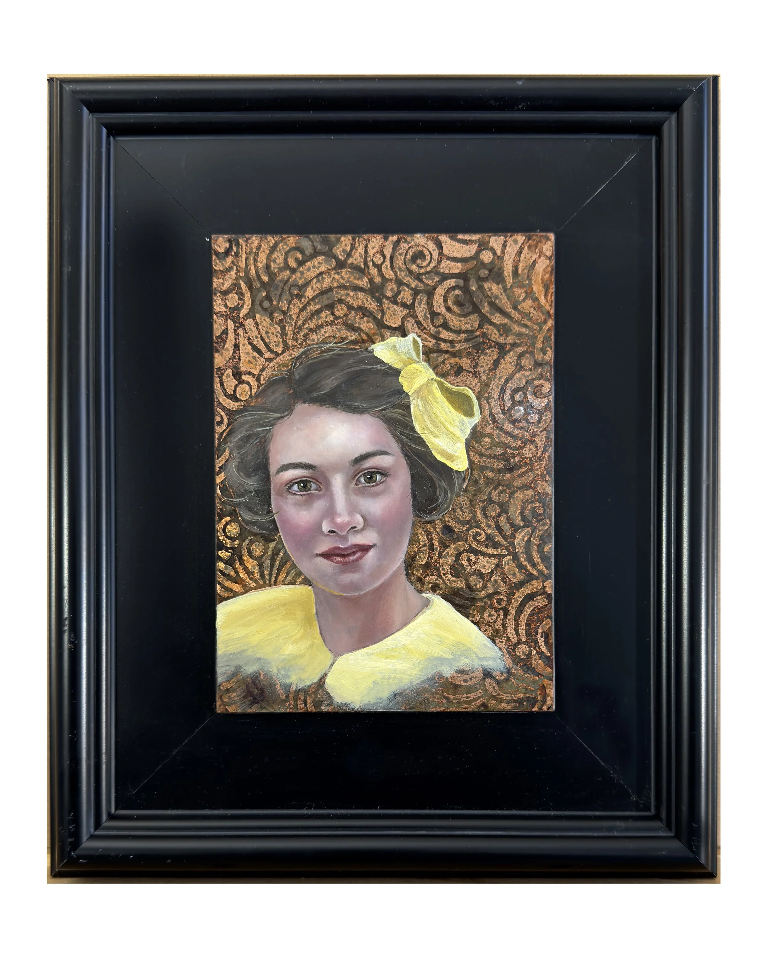 Lauren Bergman has created a series of small portraits available for direct sale through this website. These minutely and painstakingly detailed paintings have been done on copper panels, a surface popular in the Renaissance because of copper’s durability and luminosity. Bergman has developed a unique technique of creating patterns of patina that are then sealed for permanence. Each work transforms historical photographs into intimate memorials. The warm glow of the copper beneath the paint seems to emanate from within, as if capturing the eternal light of each subject’s spirit.